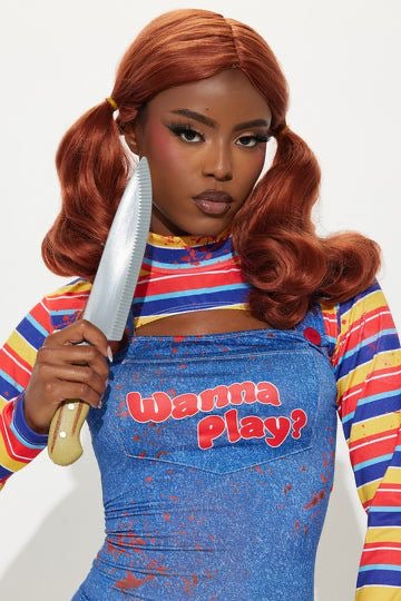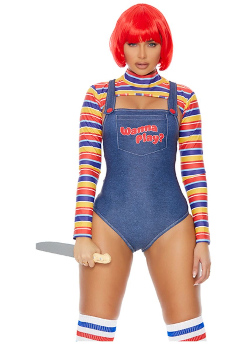 Conviértete en el terror de la noche con este disfraz de Chucky, perfecto para Halloween o fiestas temáticas de miedo. Incluye cuchillo, body, medias de red y polera de colores, logrando un look completo y aterrador.