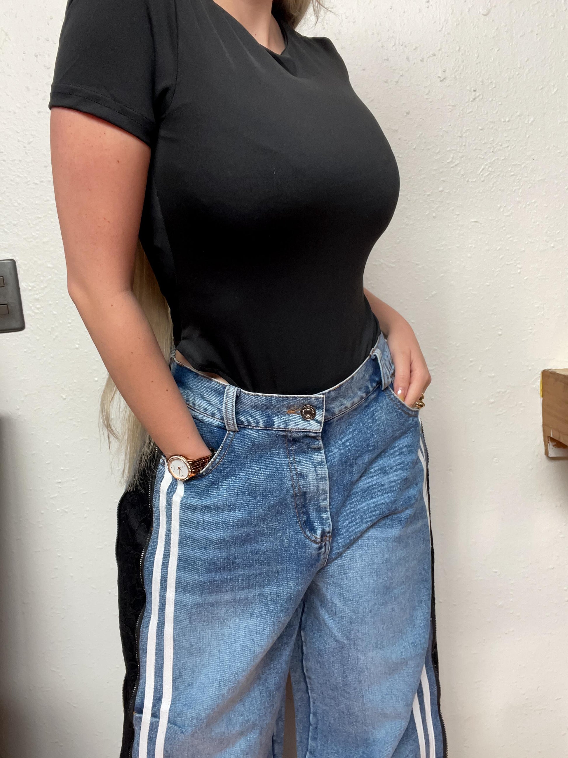 No es un jeans cualquiera, es la prenda que rompe esquemas y se adapta a tu estilo. El Pantalón Tanza cuenta con cierres laterales funcionales que puedes llevar cerrados para un look clásico o abrirlos y dejar ver el encaje más delicado, logrando un toque atrevido y ultra femenino.